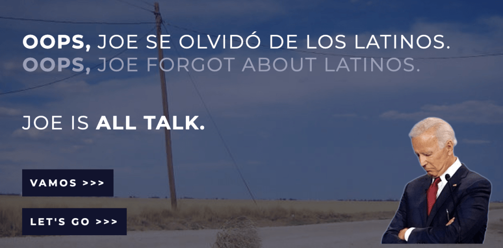“Let’s go” linkine tıkladığınızda da, Trump’ın Latin seçmenler için vaatlerini içeren başka bir sayfa karşımıza geliyor.