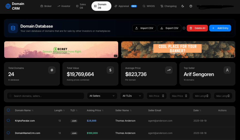 Domain DB: This one is can be used both by brokers and investors. As a broker, I keep receiving emails from people who would like to sell their domains so, for me, instead of losing these domains in emails, I keep them stored for possible future acquisitions.